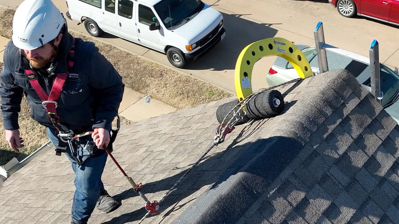 The Eveook Fall Protection System functions by anchoring two Eveook devices to the eaves of a structure. A horizontal anchor line is tensioned between these non-penetrating anchors, allowing users to work safely, perpendicular and parallel to the anchor line, with a slidable anchor point while avoiding dangerous swing falls.