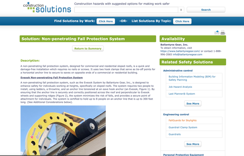Ballantyne Gear has garnered national recognition for this life-saving innovation. The Eveook system was presented to NIOSH, the National Institute for Occupational Safety and Health, in Washington D.C. and is now recognized as a CPWR Construction Solution by the Center for Construction Research and Training.